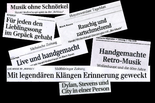 Freunde handgemachter Musik kommen bei Harald Wollenhaupt immer wieder voll auf ihre Kosten, zumal sein Repertoire weit über 350 Songs bekannter Songwriter wie Simon & Garfunkel, Cat Stevens, Bob Dylan, Neil Young,